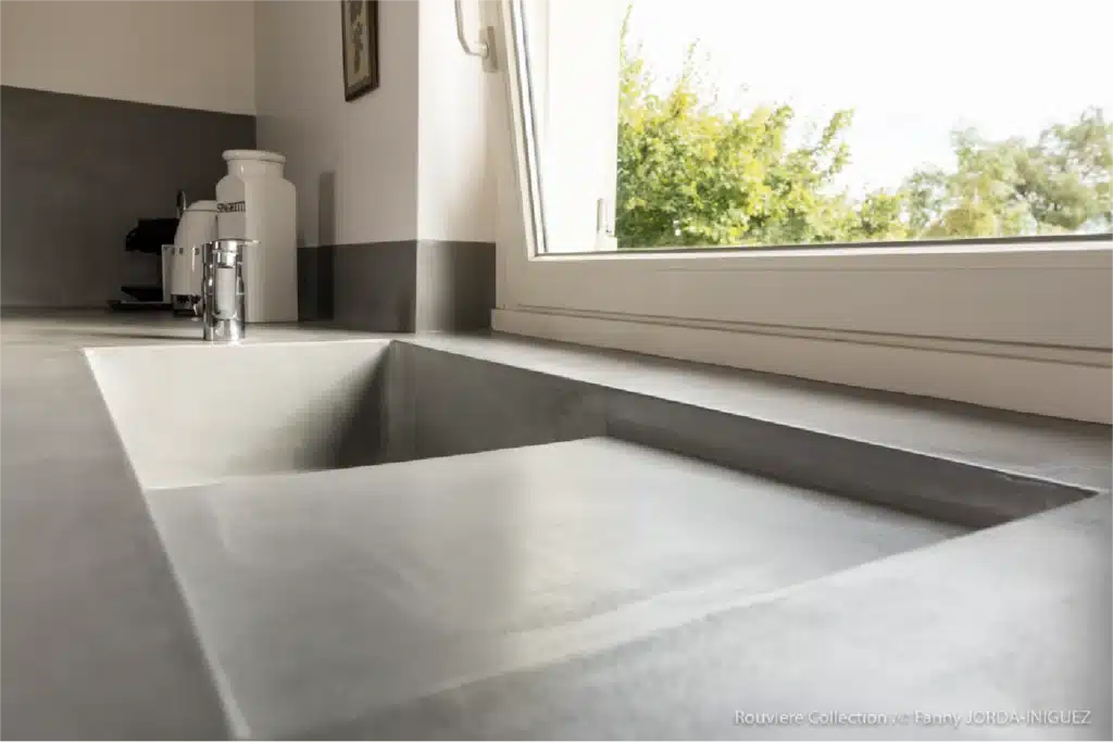 Il permet aussi la création de mobilier en béton ciré sur mesure – tables, vasques, consoles ou éléments décoratifs – pour une harmonie totale et un caractère unique dans chaque projet.